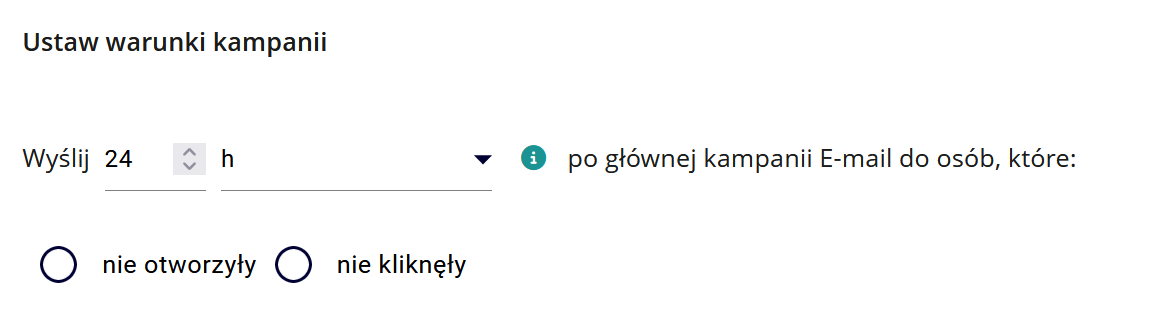 Uwaga: Opcja "nie kliknęły" będzie wyszarzona i niemożliwa do wyboru, jeśli w ustawieniach kampanii głównej E-mail (w poprzednich krokach kreatora) wyłączono śledzenie kliknięć. W takim przypadku system wyświetli stosowną informację.