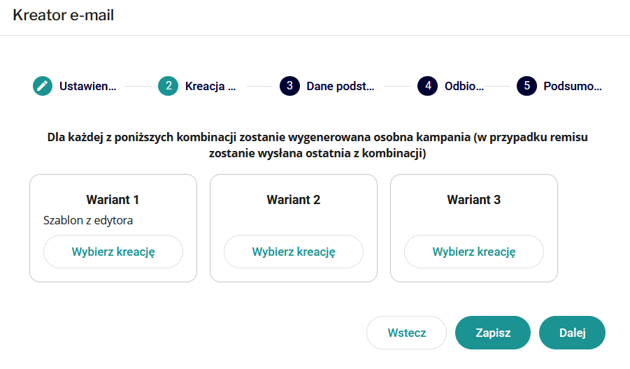 Po kliknięciu **Utwórz kampanię A/B** zostaniesz przeprowadzony przez następujące kroki: