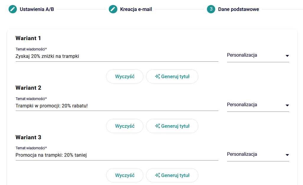 * **Jeśli testujesz Temat:** Wprowadź różne wersje tematu wiadomości dla każdego z wybranych wariantów. Możesz korzystać z opcji personalizacji (np. imię odbiorcy) za pomocą odpowiednich znaczników oraz opcji "Generuj tytuł" za pomocą AI.