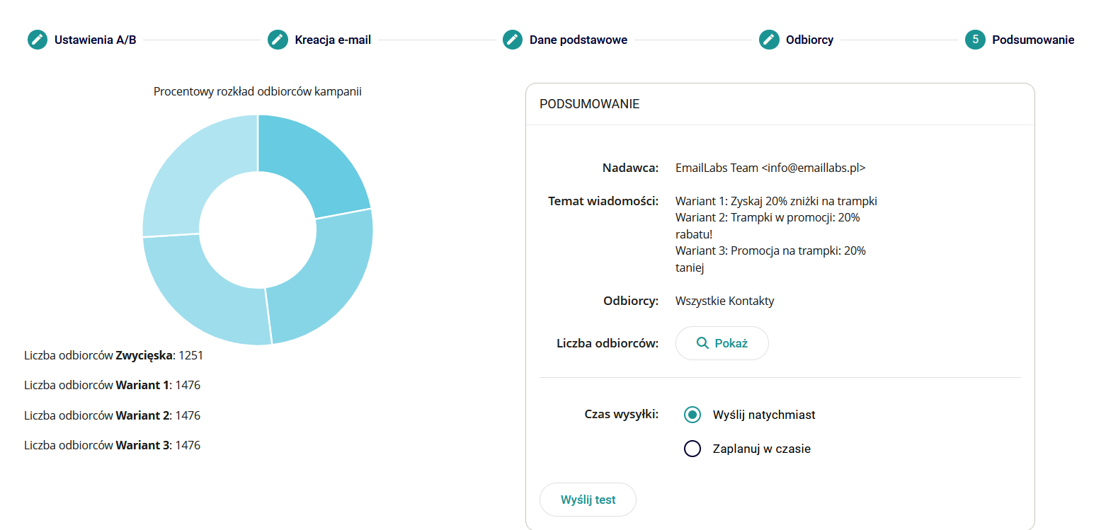 * **Wyślij test:** Umożliwia przesłanie testowych wiadomości (każdego wariantu A/B) na wskazane adresy e-mail. Pozwala przeprowadzić symulację personalizacji.