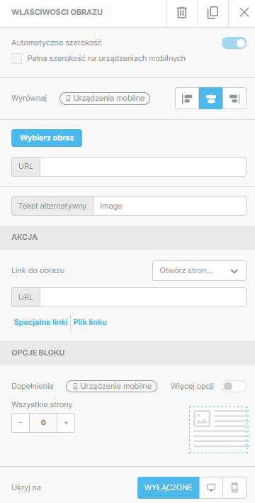 Gdy jesteś w Trybie projektowania mobilnego, możesz klikać na poszczególne bloki zawartości i wiersze, aby dostosować ich właściwości wyłącznie dla wersji mobilnej. Opcje personalizacji obejmują m.in.: