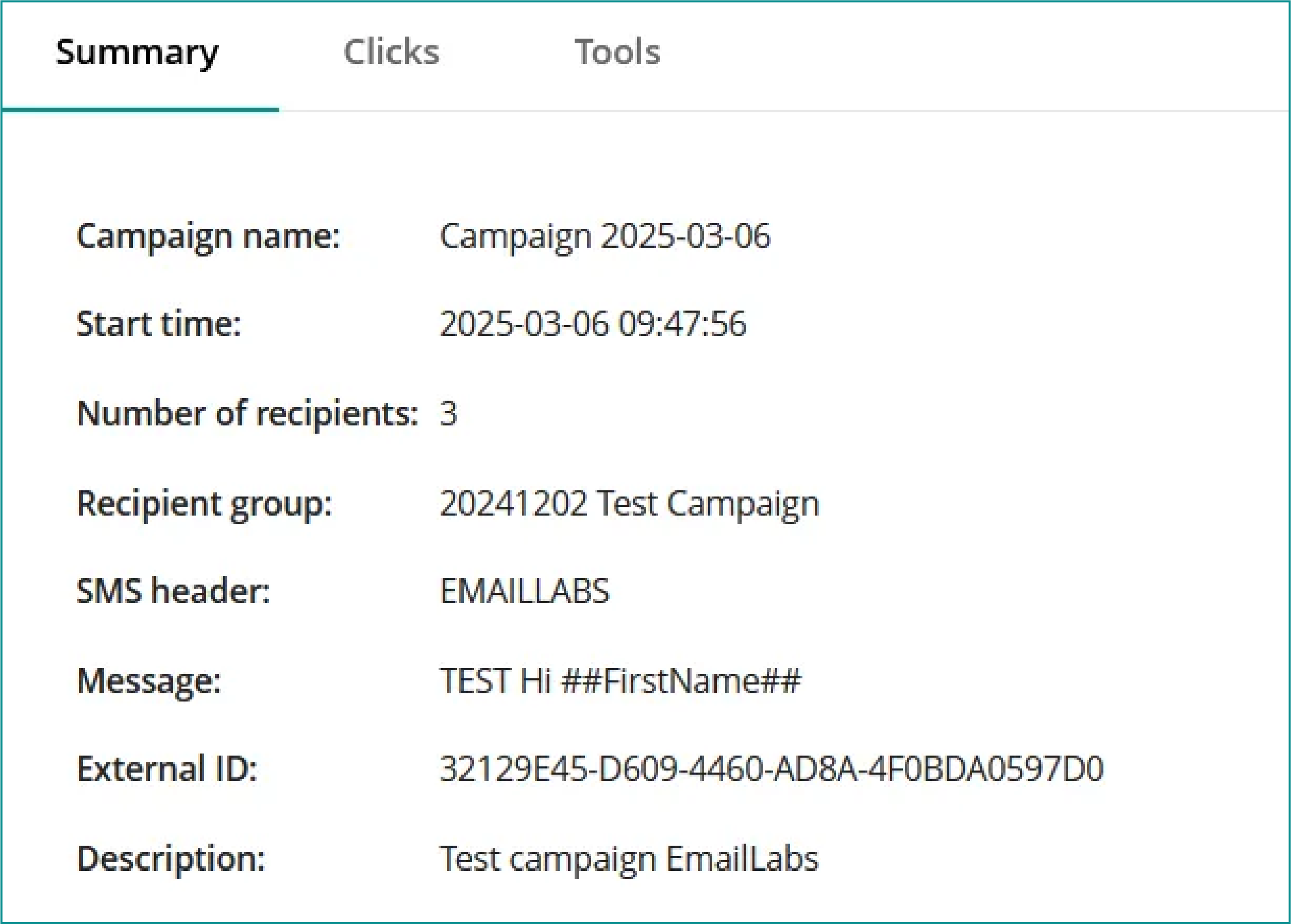 This section contains key information about the SMS campaign, including: