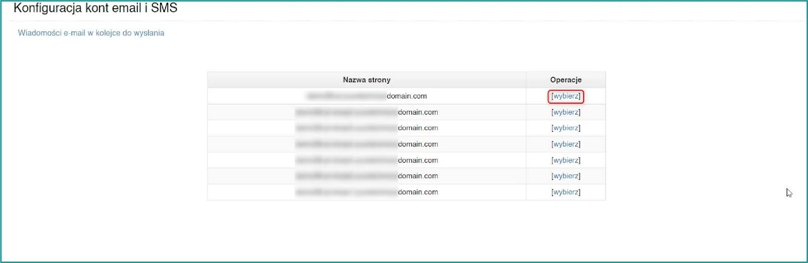 W widoku **Konfiguracja kont email i SMS** znajdź domenę, dla której chcesz ustawić serwer SMTP, i kliknij opcję **wybierz** przy tej domenie.